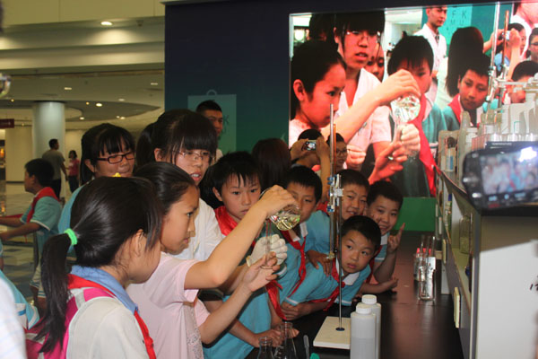 在科研人員的指導(dǎo)下,現(xiàn)場(chǎng)的“紅領(lǐng)巾”正專(zhuān)心地做液體滴定實(shí)驗(yàn)。